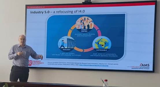 Seán McLoone教授提到,在过去35年中,人工智能取得了显著进展,从20世纪90年代的浅层神经网络到过去十年的深度学习模型,这些进展为工业领域带来了许多成功的应用,如软测量、自动检测、预测性维护和故障诊断等等。事实上,人工智能一直是支持从工业3.0向工业4.0转型的关键信息通信技术之一。随着我们将注意力转向实现下一次工业进化/革命(工业5.0)——即实现以人为本、可持续且具有韧性的制造企业,人工智能正越来越成为核心焦点。