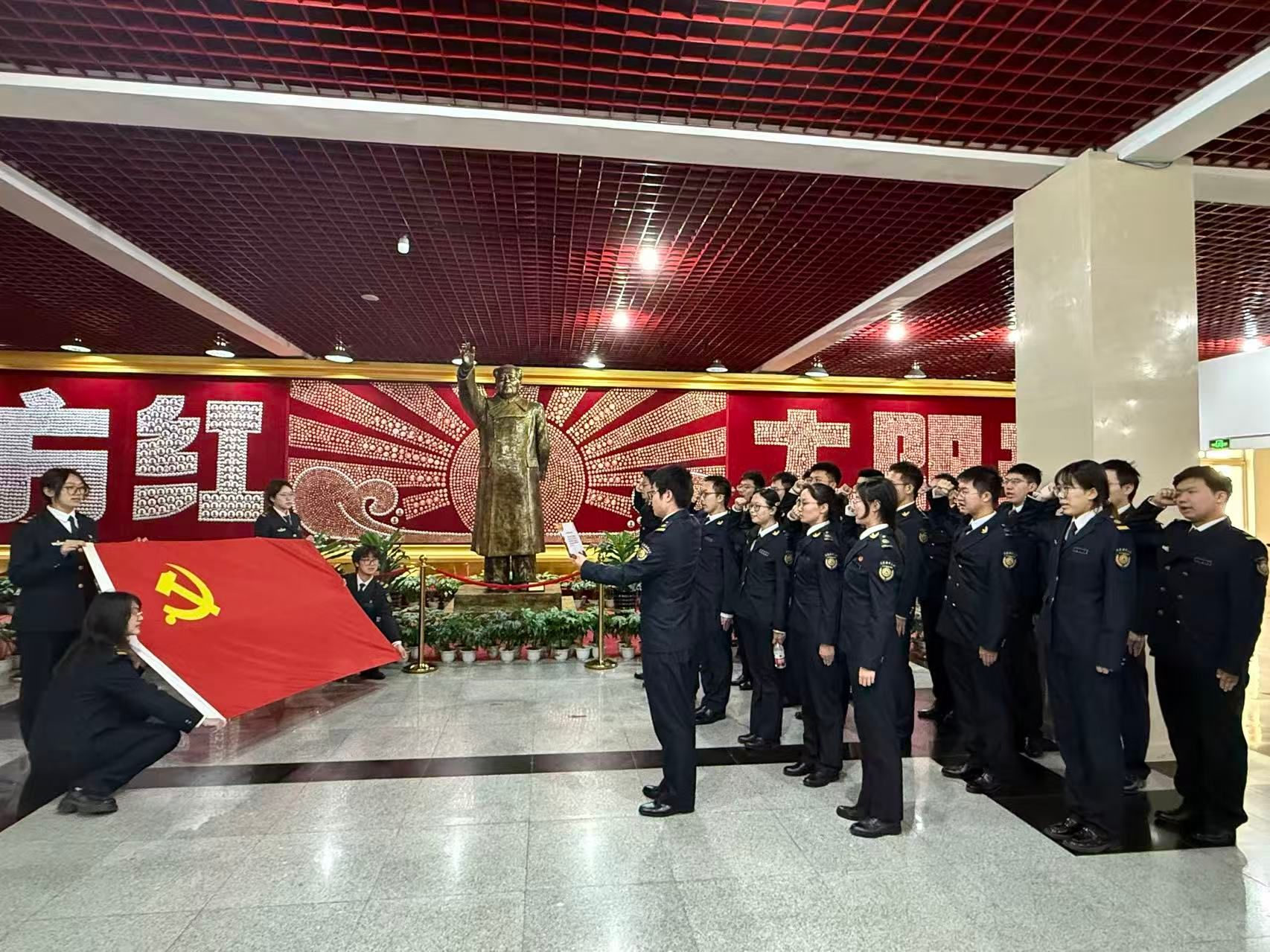 在庄严肃穆的党旗前,全体党员举行了重温入党誓词仪式。铿锵有力的誓言,字字千钧,掷地有声,响彻展厅,也激荡在每一位党员的心间。重温入党誓词,是对初心使命的再次庄严承诺,是对理想信念的又一次深刻洗礼,更是对廉洁自律要求的再次强化宣示。凝聚着对党的无限忠诚,对人民的庄严承诺,对纪律的敬畏和恪守。
